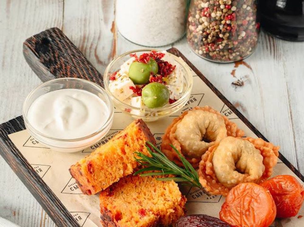 В «Сыроварне» угостят домашним сыром чанах, золотистыми жареными пельменями, сочными оливками, ароматной курагой и финиками. Дополняют сет свежий хлеб с вялеными томатами и густая сметана.
